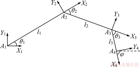 其中:n=3;0Tn为各杆件变量θ1,θ2和θ3的函数;i-1Ai为i坐标系对i-1的相对变换矩阵,