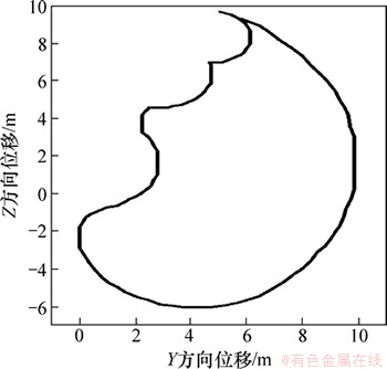 设置各个液压油缸阶跃函数,在铲斗齿尖处创建基本测量点,对工作装置进行数值仿真计算并显示结果。图4所示为通过运动仿真绘制出来的挖掘机工作装置主要作业范围,图5所示为斗齿尖位移曲线。