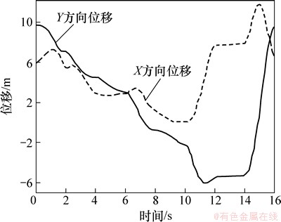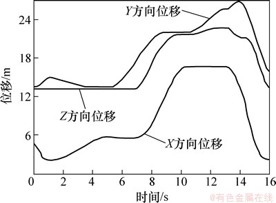 设置液压挖掘机模型的基本参数后,进行动力学仿真。仿真时间为16 s,仿真步长为500,在仿真过程中软件自动计算各个刚体间的作用力,可得到各重要零件和铰点的位移和载荷变化情况。图7所示为铲斗斗齿齿尖的位移曲线。