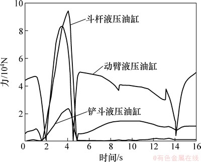 图8 动臂、斗杆和铲斗液压油缸受力变化曲线