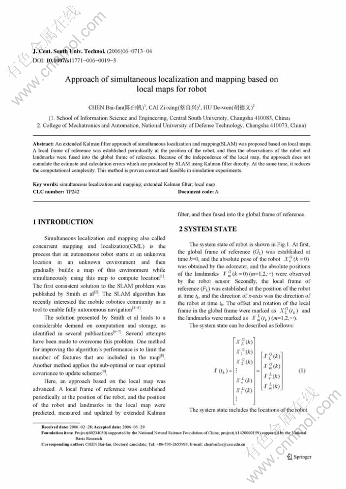 Key words:simultaneous localization and mapping;extended Kalman filter;local map