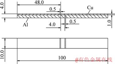 参考GB/T 6396—1995中规定的层状复合材料层间结合强度(剪切强度)拉剪试验方法评价铜包铝复合扁排的界面结合强度(剪切强度)。试样的形状和尺寸如图2所示。拉剪试验设备采用10 kN万能材料试验机,夹头移动速度为0.5 mm/min。采用ZEISS EVO 18扫描电子显微镜观察界面层的微观形貌,采用BRUKER QUANTAX EDS系统分析界面附近的成分。