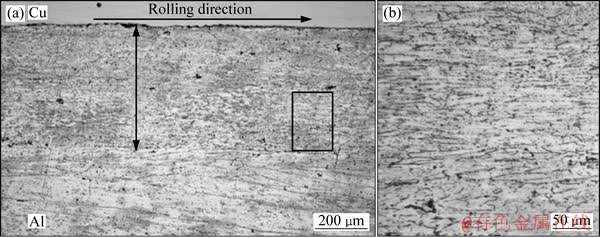 金相观察沿着扁排的轧制方向取样,试样经砂纸磨光、机械抛光后,铜包覆层采用配比为FeCl3 (5 g)+HCl(2 mL)+H2O(90 mL)的三氯化铁溶液侵蚀,铝芯采用配比为HF(10 mL)+H2O(90 mL)的氢氟酸溶液侵蚀。采用NIKON ECLIPSE LV150正置式反射金相显微镜观察显微组织。
