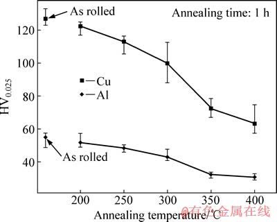 图6 退火温度对铜包铝复合扁排的铜层和铝芯显微硬度的影响
