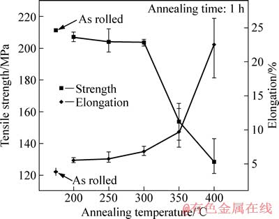 Fig. 7 Effect of annealing temperature on tensile strength and elongation of CCA flat bar
