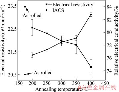 在200~400 ℃下对铜包铝复合扁排进行退火,扁排电阻率(沿长度方向测量的电阻率标记为纵向电阻率)和相对导电率的变化如图10所示。由图10可知,未退火的铜包铝复合扁排电阻率为23.48 mΩ·mm2/m。随着退火温度的升高,纵向电阻率单调减小,在400℃退火时电阻率为20.84 mΩ·mm2/m。