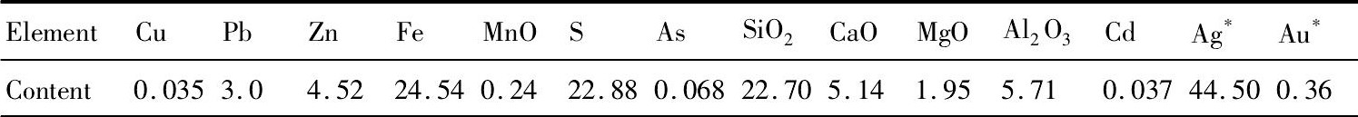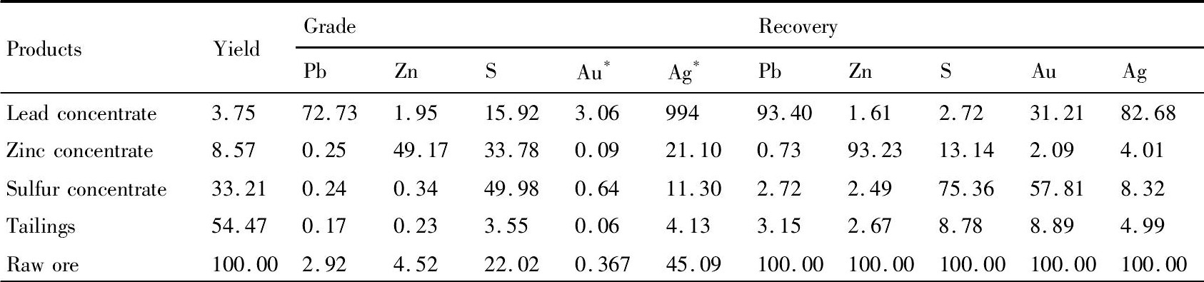 2.采用新工艺处理该矿石, 最终闭路试验可得含铅72.73%、含金3.06 g·t-1、含银994 g·t-1, 铅回收率93.40%、金回收率31.21%、银回收率82.68%的铅精矿;含锌49.17%, 锌回收率93.23%的锌精矿;含硫49.98%, 硫回收率75.36%的硫精矿。