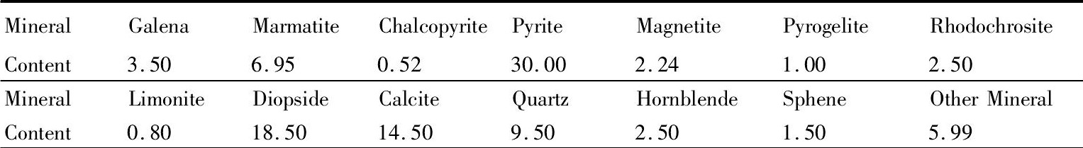 实验所用矿样来自锡铁山铅锌矿深部 (2702m) 以下矿石。矿石中金属矿物主要是黄铁矿, 其次为铁闪锌矿和方铅矿, 还可见少量的磁铁矿、褐铁矿、黄铜矿、磁黄铁矿。脉石矿物则以透辉石居多, 其次是石英、方解石、绿泥石等, 还有少量的榍石、萤石、石榴石。其中, 方铅矿多以形状规则的自形、半自形晶型为主, 易沿解理发生碎裂;部分方铅矿内部包含细小的脉石;此外, 还有少量方铅矿被包含于铁闪锌矿中。铁闪锌矿为矿石中锌的主要赋存矿物, 约有30%的铁闪锌矿晶粒内部含有由固溶体分离作用析出形成的乳滴状黄铜矿微粒;黄铁矿为矿石中含量最高的金属矿物, 常呈不规则团块状集合体零星分布在脉石中, 集合体的裂隙多被石英填充, 粒度多在1~2 mm之间。