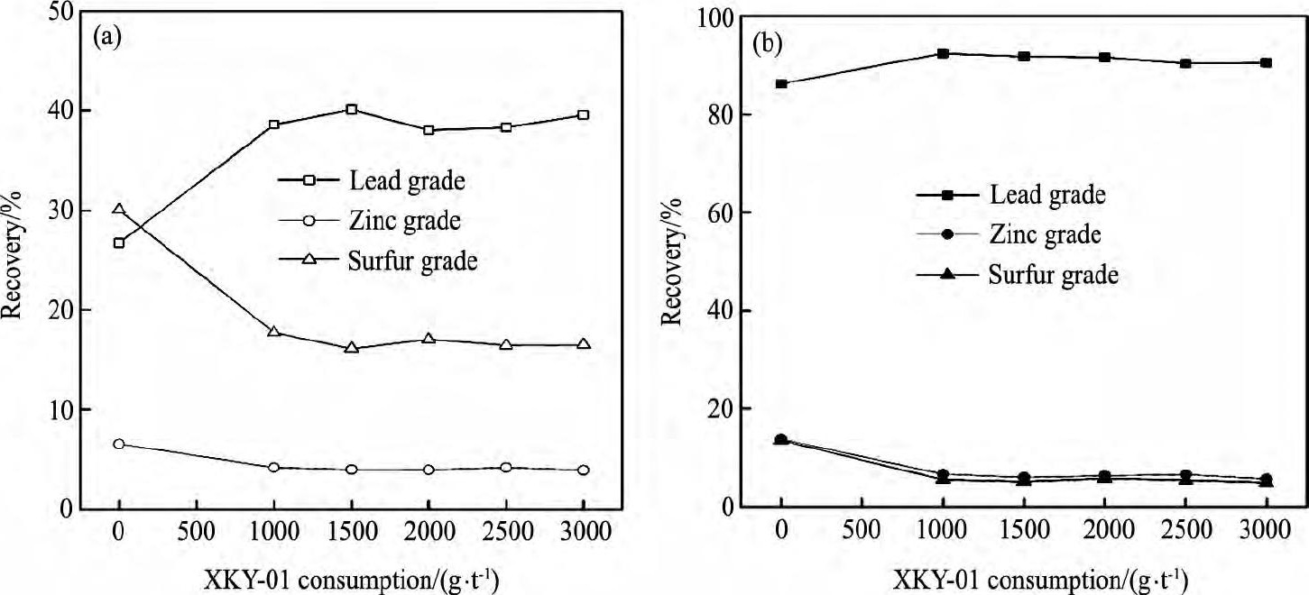 图2 (a, b) 分别为XKY-01用量对铅粗精矿中铅锌硫品位和回收率的影响。可见, 以XKY-01为铅粗选抑制剂可显著改善铅粗精矿质量, 降低铅精矿中锌、硫杂质含量, 当XKY-01为1500 g·t-1时, 选矿综合指标达到最佳, 继续增加其用量, 铅品位及回收率变化不大。
