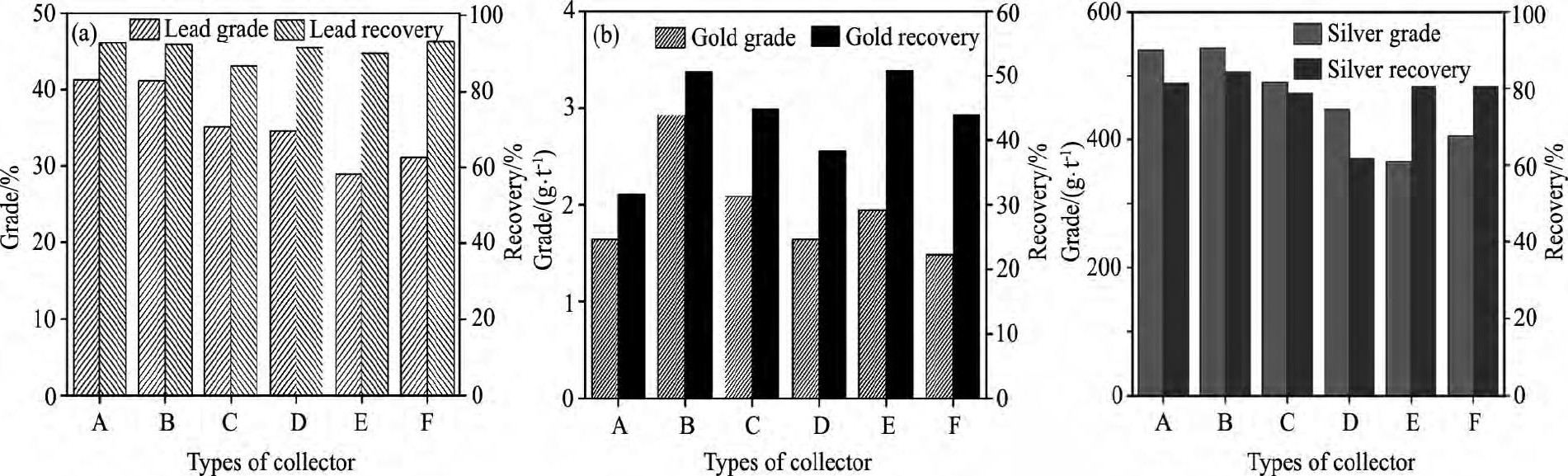 图3 (a~c) 分别为铅粗选辅助捕收剂种类对铅粗精矿中铅、金、银品位及回收率的影响。可见, 当辅助捕收剂LP-12配合25#黑药共同浮选铅矿物时, 能稳定铅指标的同时, 提高金银的浮选回收率, 相较其他辅助捕收剂而言, 对金银的回收效果最佳。