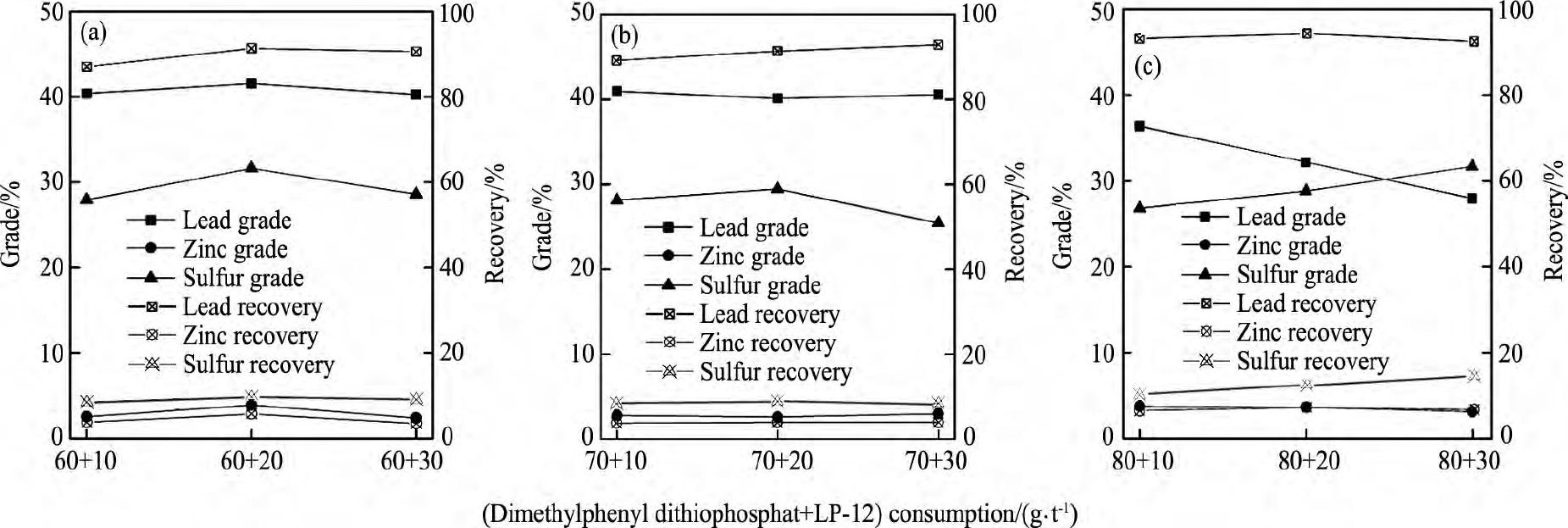 图4 (a~c) 分别为铅粗选捕收剂用量对铅粗精矿中铅、金、银品位及回收率的影响。可见, 当 (25#黑药+LP-12) 用量为 (70+30) g·t-1时, 铅综合指标达到最佳, 继续增加其用量, 铅品位及回收率变化不明显, 综合考虑选取 (25#黑药+LP-12) 用量为 (70+30) g·t-1较宜。