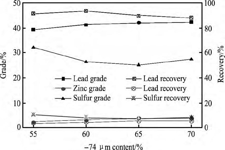 由图5可知, 随磨矿细度 (-74μm含量) 由55%增至70%, 铅粗精矿中铅锌品位均呈上升趋势, 但铅回收率却先增高后下降, 说明细度过高对铅浮选不利, 锌硫上浮量增大, 不易抑制。当磨矿细度 (-74μm含量) 为60%时, 铅粗精矿的选别指标相对最佳。综合考虑磨矿成本等因素, 选取-74μm占60%的磨矿细度为宜。
