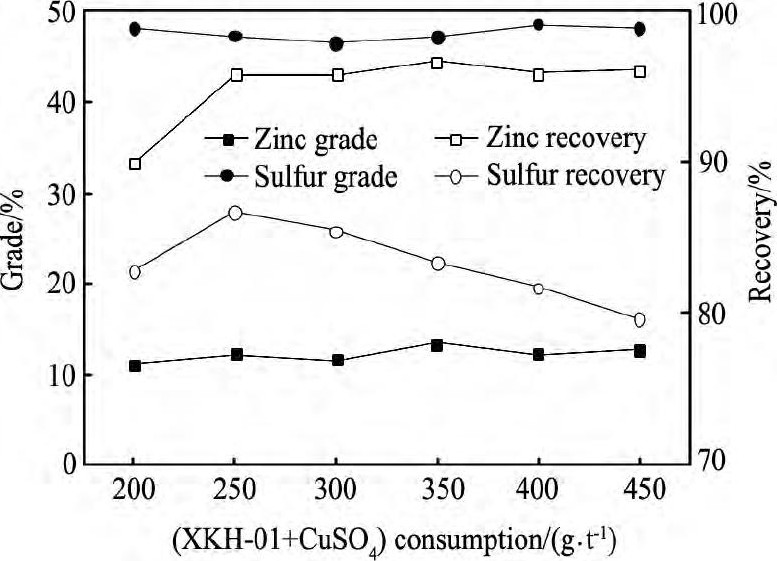 由图6可知, 当 (XKH-01+Cu SO4) 用量为350g·t-1时, 锌的综合指标相对较优, 继续增大其用量, 锌硫品位及回收率变化不大, 综合考虑选取 (XKH-01+Cu SO4) 用量为350 g·t-1较宜。
