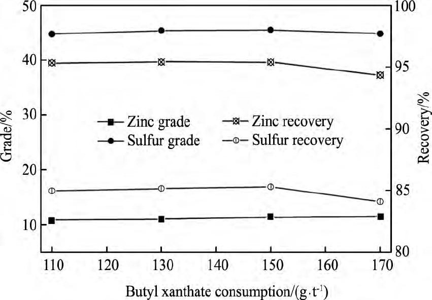 由图7可知, 随丁基黄药用量增大, 锌品位缓慢上升, 而回收率却先增大后显著下降, 此外, 硫指标也表现出先升高后下降趋势。因此, 选取丁基黄药用量为130 g·t-1较宜。