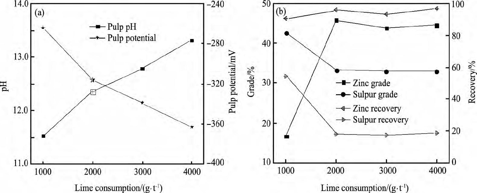由图8 (a, b) 可知, 当石灰用量为2000 g·t-1时, 矿浆p H值及矿浆电位分别为12.36和-316m V, 该矿浆体系下已较好地抑制了硫的上浮, 锌粗精矿综合指标达到最佳。继续加大石灰用量, 虽然锌回收率有所增加, 但其品位呈下降趋势, 可能是2000 g·t-1石灰用量所营造的矿浆氛围已有利于黄铁矿的自身氧化抑制[20], 当矿浆电位过低时导致铁闪锌矿自身氧化抑制的发生, 从而影响其选矿指标。综合考虑高碱、低电位矿浆环境给选矿带来的不利影响, 选取矿浆p H值及矿浆电位为12.36和-316 m V左右较为合理。
