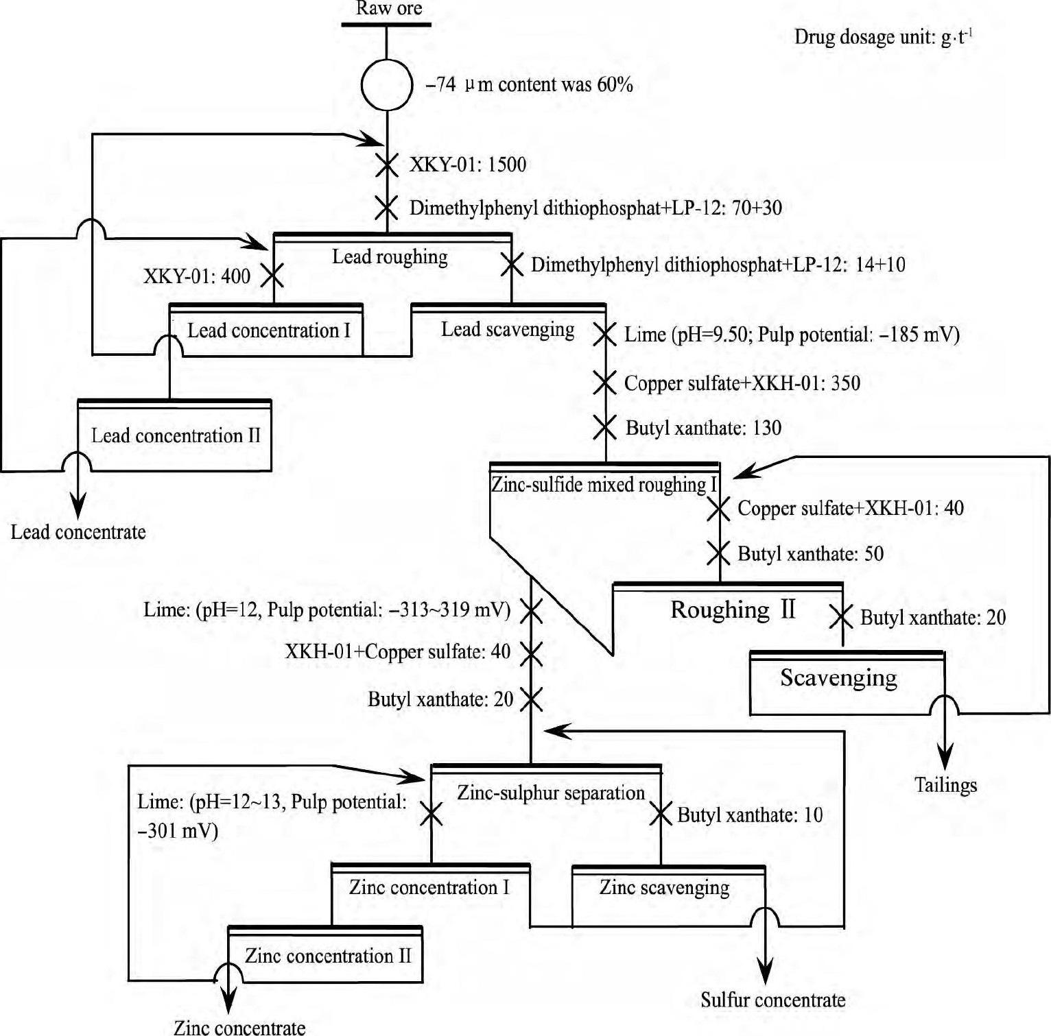 There were various minerals under 10 middle of Xitieshan lead-zinc mine, and lead, zinc, sulfur, and associated gold and silver could be comprehensively recycled.For efficient comprehensive recovery of valuable metals, the experimental study on new mineral processing of ore was conducted.In the conditions of the process with priority floating lead, zinc sulfide mixed floating, zinc sulphur separation, and the grinding fineness of-74μm accounting for 60%, the lead flotation circuit chose natural p H condition, added XKY-01 as inhibitor, the high efficient auxiliary collector LP-12 of Au, Ag minerals cooperated with dimethylphenyl dithiophosphat as the lead ore collector, thus, improved gold and silver mineral collecting.After adjusting the tailings of floating lead p H to 9.5 or so, with XKH-01 and copper sulfate as activator of zinc sulfide mixed floating and butyl xanthate as a collector, the pulp potential of zincsulfide mixed rough concentrate was controlled by Ca O and made it an effective separation.In a closed circuit test, lead concentrate was obtained with the lead grade of 72.73%and recovery of 93.40%, the gold grade of 3.06 g·t-1and recovery of 31.21%, the silver grade of 994 g·t-1and recovery of 82.68%.Zinc concentrate was obtained with the zinc grade of 49.17%and recovery of 93.23%.Sulfide concentrate was obtained with the sulfide grade of 49.98%and recovery of 75.36%.Compared to the production process, in the case of the grade of lead, gold, silver in the deep ore was declined, the new technology effectively stabilized and improved the mineral processing indicators of main metal lead and zinc, and improved the recycled efficiency of precious metals gold and silver.