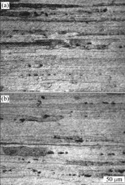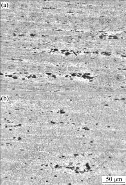 The tensile properties of hot rolled thick plate along transverse direction are listed in Table 3. The yield strength and elongation of hot rolled plate for FCR are higher than those of plate for CSR, but the ultimate tensile strength has no difference. The microstructures of hot rolled thick plates for CSR and FCR are presented in Fig.2. The remained phases are found to distribute along rolled direction for CSR plate (Fig.2(a)), while, become less and smaller for FCR plate, and the trend to distribute along rolled direction becomes unobvious (Fig.2(b)).