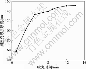 图3 剧烈变形层厚度与喷丸时间的关系