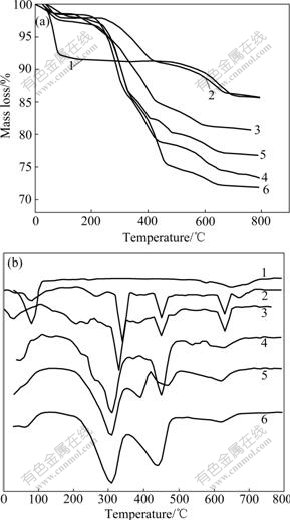 Fig.2 TG (a) and DTG (b) curves of Na-MMT and P-MMTs: 1—Na-MMT; 2—DDTBP-MMT-1; 3—DDTBP-MMT-2; 4—DDTBP-MMT-3; 5—DTBP-MMT; 6—HDTBP-MMT