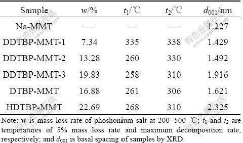 Compared with Na-MMT, the water content of P-MMTs at 50-200℃ was smaller due to the hydrophobic nature of phosphonium salts. In addition, the phosphonium salt contents of P-MMTs could be determined at 200-500 ℃, and the phosphornium salt contents (mass fraction) of DDTBP-MMT-1, DDTBP- MMT-2, DDTBP-MMT-3, DTBP-MMT and HDTBP- MMT are 7.34%, 13.28%, 19.83%, 16.88% and 22.69% (Table 1), respectively.