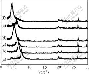 Fig.3 XRD patterns of Na-MMT and P-MMTs: (a) Na-MMT; (b) DDTBP-MMT-1; (c) DDTBP-MMT-2; (d) DDTBP-MMT- 3; (e) DTBP-MMT; (f) HDTBP-MMT