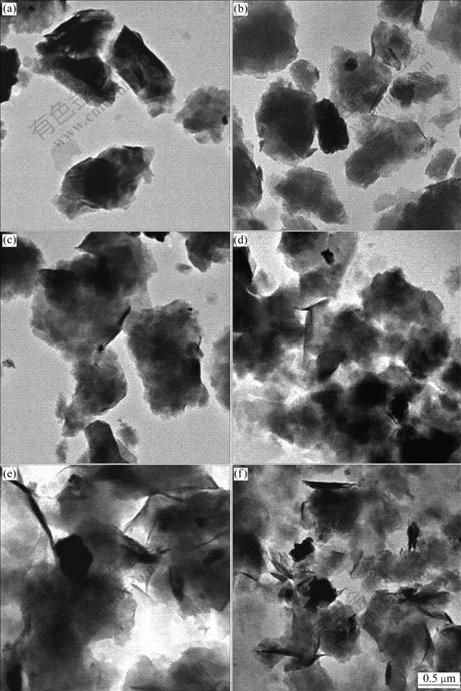 Fig.4 TEM images of different samples: (a) Na-MMT; (b) DDTBP-MMT-1; (c) DDTBP-MMT-2; (d) DDTBP-MMT-3; (e) DTBP- MMT; (f) HDTBP-MMT