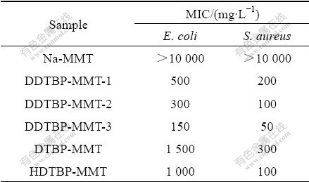 Moreover, based on the broad-spectrum antibacterial property of quaternary alkylphosphonium salt, P-MMTs can also be used to resist bacteria and purify water rather than to cause secondary pollution. There are few reports on studying the antibacterial activity of P-MMTs yet. Only HERRERA et al [15] reported that cetylpyridinium modified montmorillonites could facilitate the removal of bacteria from various water sources. Hence, further research is very meaningful.
