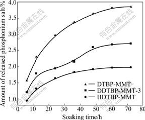 The amount of released phosphonium salts from DTBP-MMT, DDTBP-MMT-3 and HDTBP-MMT for different soaking time is shown in Fig.5.