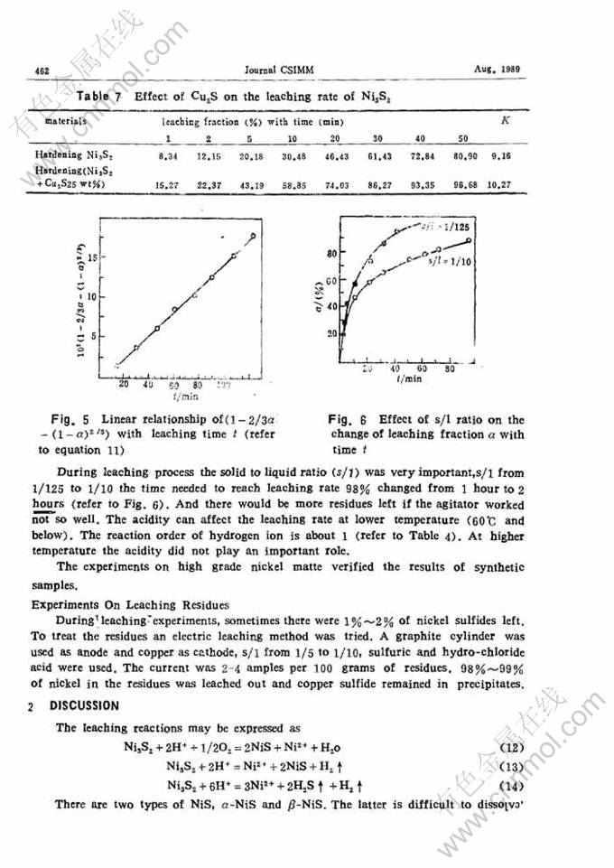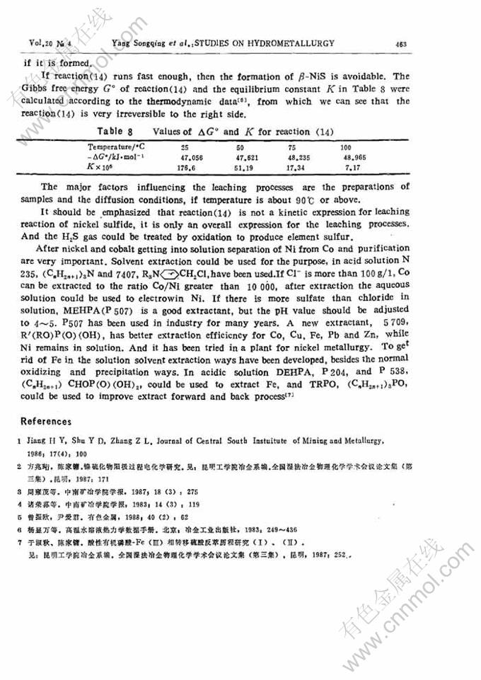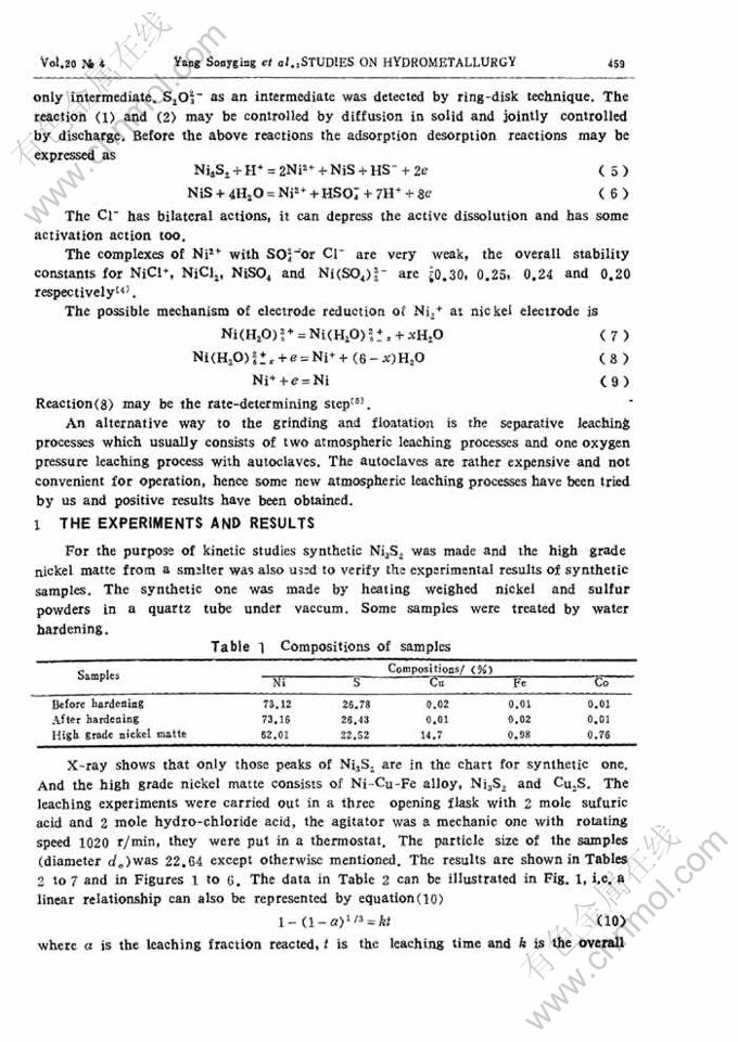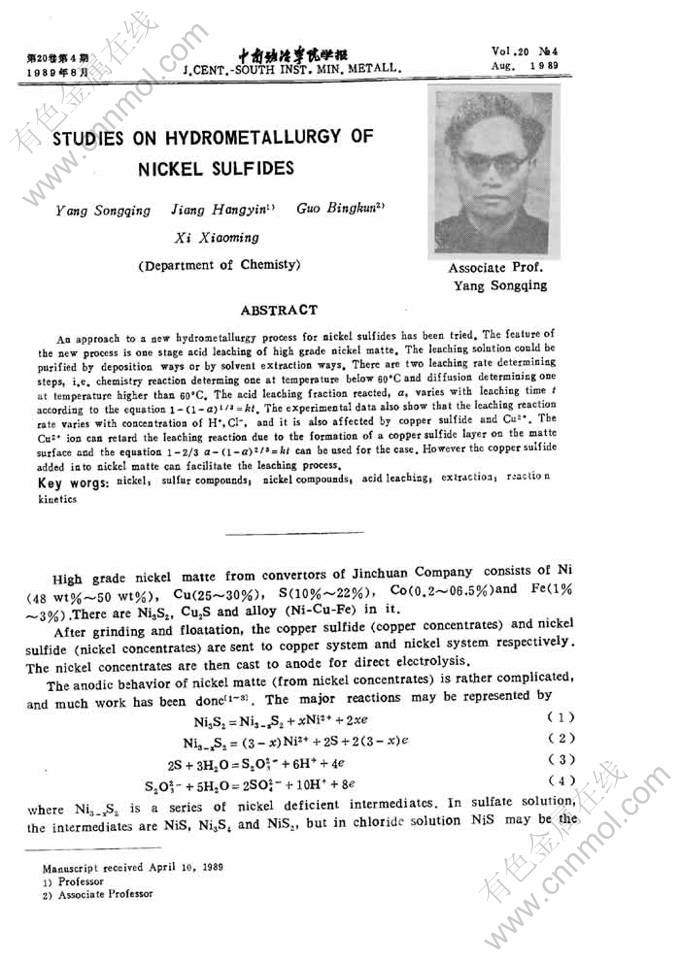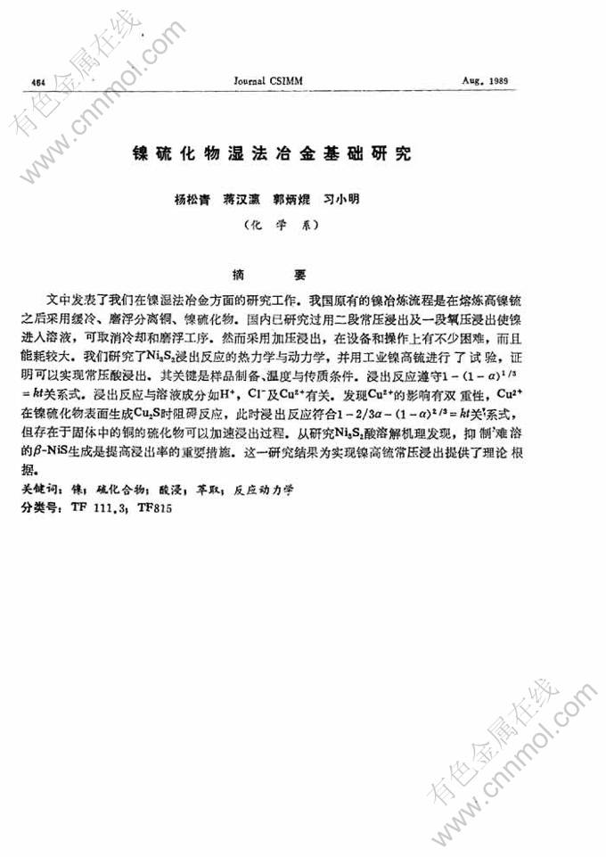 Key words:nickel; sulfur compounds; nickel compounds; acid leaching; extraction; reaction kinetics