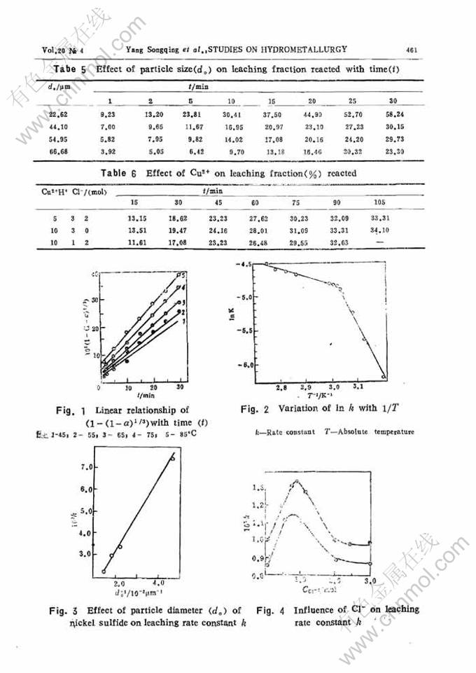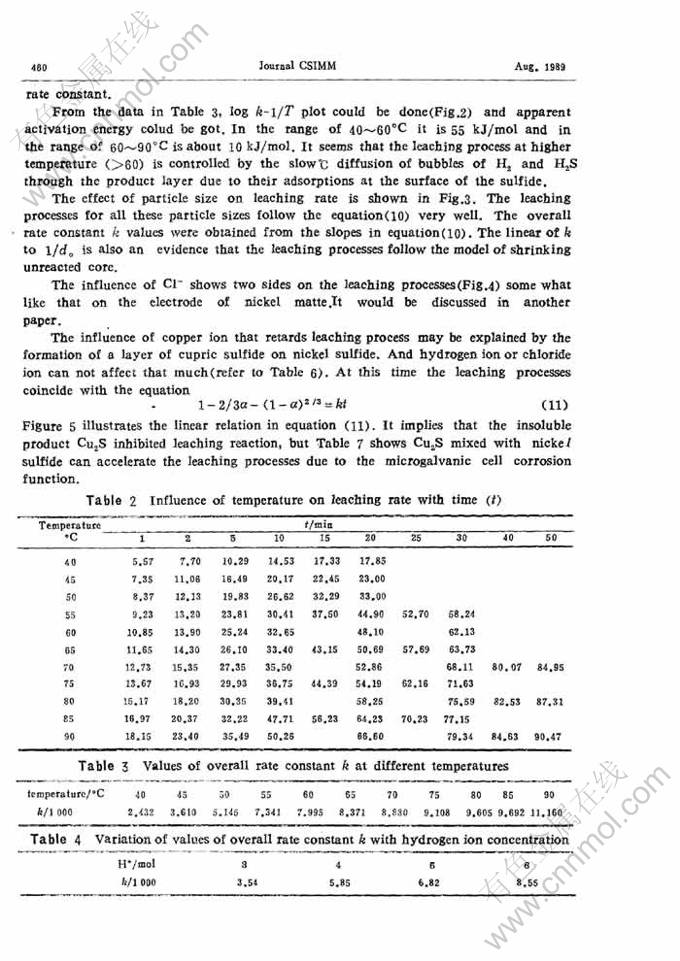 Abstract: An approach to a new hydrometallurgy process for nickel sulfides has been tried. The feature ofthe new process is one stage acid leaching of high grade nickel matte. The leaching solution could bepurified by deposition ways or by solvent extraction ways. There are two leaching rate determiningsteps, i.e. chemistry reaction determing one at temperature below 60℃ and diffusion determining oneat temperature higher than 60℃. The acid leaching fraction reacted, a, varies with leaching time taccording to the equation 1-(1-a)1/3=kt. The experimental data also show that the leaching reactionrate varies with concentration of H+, C1-, and it is also affected by copper sulfide and Cu2+. TheCu2+ ion can retard the leaching reaction due to the formation of a copper sulfide layer on the mattesurface and the equation 1-2/3a-(1-a)2/3=kt can be used for the case. However the copper sulfideadded into nickel matte can facilitate the leaching process.