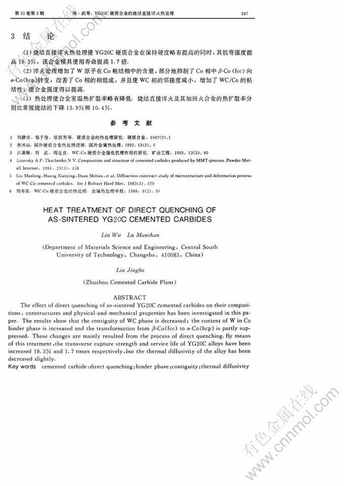 摘 要:研究了烧结直接淬火热处理对YG20C硬质合金的组织、结构和物理机械性能的影响.结果表明,WC硬质相邻接度值降低,W原子在CO粘结相中的含量增多,以及部分地抑制了面心立方钴向密排六方钴转变,上述变化主要是由烧结合金直接淬火处理而引起的.这种热处理使合金抗弯强度提高20%左右,使用寿命增加1倍以上,但导致合金的热扩散率略有下降.