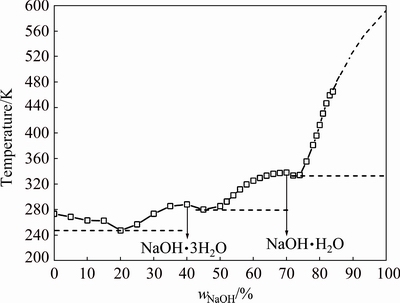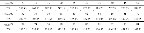 Table 2 shows the freezing points of NaOH solutions from literature [23]. According to the phase rule, the phase diagram of NaOH-H2O system is plotted in Fig. 1, where the high freezing points appear at 40% NaOH and 70% NaOH, which correspond to NaOH·3H2O and NaOH·H2O, respectively. The eutectic temperature of H2O(s)-NaOH·3H2O(s) is 247.15 K, which is the lowest eutectic point in NaOH-H2O system.