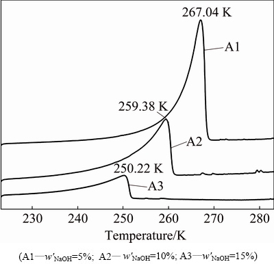 Figure 2 shows the DSC profiles of sodium aluminate solutions with different concentrations at the same caustic ratio in the temperature range from 223.15 to 283.15 K. Each DSC melting profile has only one endothermic peak, which is attributed to the ice melt. The phase transition temperatures are at 267.04, 259.38 and 250.22 K, respectively. This is illustrated that the NaOH concentration is a major factor to the ice melting temperature in sodium aluminate solutions with low concentrations.