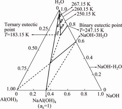 For the supersaturated sodium aluminate solutions, it is extremely difficult to plot the comprehensive low-temperature phase diagram of NaOH-Al(OH)3-H2O system as the accurate phase transition is difficult to measure with current technologies. Therefore, a pre- liminary projection phase diagram of NaOH- Al(OH)3-H2O system is plotted in Fig. 7 according to the compositions of sodium aluminate solutions and their phase transition temperatures. The phase transition process of sodium aluminate solutions can be divided into three steps: ternary eutectic reaction, binary eutectic reaction and ice melt. The ternary eutectic reaction proceeds at 183.15 K. In addition, the binary eutectic reaction begins when the temperature decreases, and then the binary eutectic points for different concentrations of sodium aluminate solutions would form a line. The temperatures of ice melting isotherms for sodium aluminate solutions with low concentrations of 5%, 10% and 15% are about 267.15, 260.15 and 250.15 K, respectively, which decrease with the increase of NaOH concentration. In this experiment, it is noted that the NaOH concentration (<40%) and αk (>1) of sodium aluminate solutions are limited as the low temperature is hard to achieve. Meanwhile, the transformation of non-crystal to crystal cannot be plotted in Fig. 7.