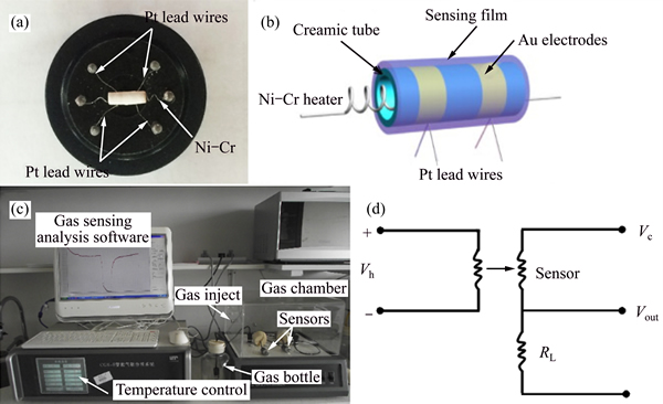 Fig. 1 completed gas sensing device (a), ceramic tube (b), CGS-8 intelligent gas-sensing analysis system (c) and measuring schematics (d)