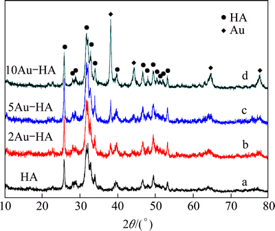 Fig. 2 XRD patterns of pure HA (a), 2Au-HA (b), 5Au-HA (c) and 10Au-HA (d)