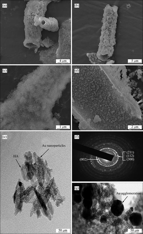 Fig. 3 SEM images of pure HA (a), 5Au-HA (b), outer surface of pure HA(c), inner surface of pure HA(d), TEM image of 5Au-HA (e), selected area electron diffraction(SAED) pattern of 5Au-HA(f), and TEM image of 10Au-HA (g)