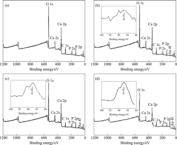 Fig. 4 XPS general spectra of pure HA (a), 2Au-HA (b), 5Au-HA (c), 10Au-HA (d) powders (XPS narrow scan spectra of Au element are presented for samples with Au concentration of 2% (b), 5% (c) and 10% (d))