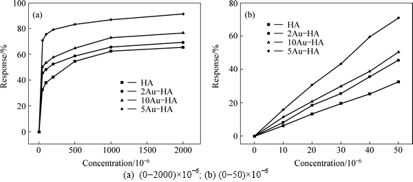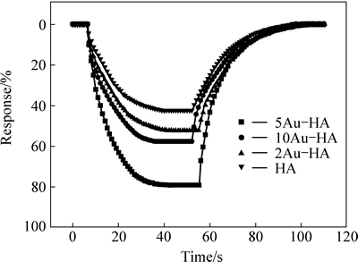 The gas-sensing properties of materials were performed at room temperature. Figure 5 shows the responses of pure and Au-HA to different concentrations of NH3. It can be seen that the response value increases with increasing the concentration of ammonia. In the low concentration range (from 10×10-6 to 50×10-6)(Fig. 5(b)), the increase in the response depends linearly on the concentration, while the response increases slowly in the range of (50-2000)×10-6, and gradually saturates at above 1000×10-6. The 5Au-HA shows the highest response in all the samples. The response of 5Au-HA increases with increasing NH3 concentration below 1000×10-6 (the response value is about 86.7%), and finally reaches the saturation at about 2000×10-6 (the response value is about 90.1%). The response of 10Au-HA is lower than that of 5Au-HA, which may be due to the agglomeration of gold nanoparticles (Fig. 3(g)).One of the main factors affecting the reaction kinetics is the size of Au nanoparticles. The Au nanoparticles in the range of 2-4 nm in size were found to be the most active for many catalytic applications [22]. In this work, the agglomeration of gold nanoparticles leads to the decrease of the sensing performance of 10Au-HA.