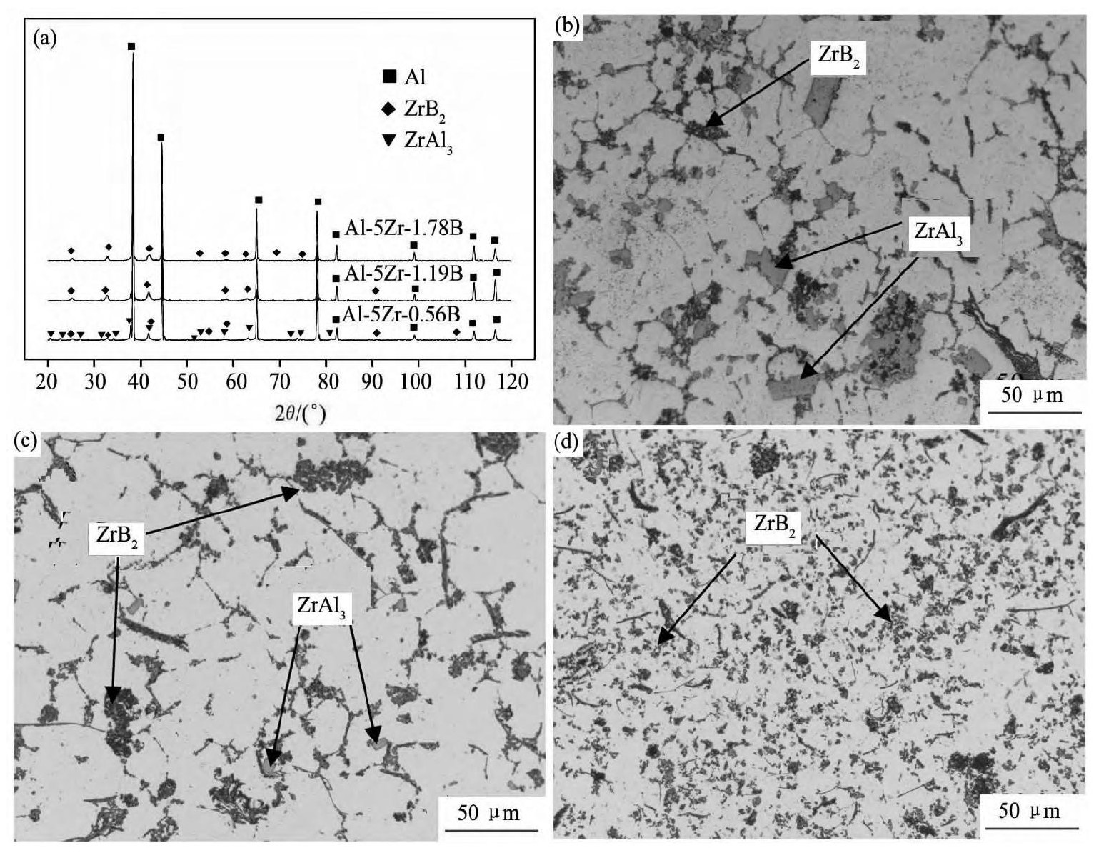 (a) XRD pattern; (b, c, d) OM images: (b) Al-5Zr-0.56B; (c) Al-5Zr-1.19B; (d) Al-5Zr-1.78B