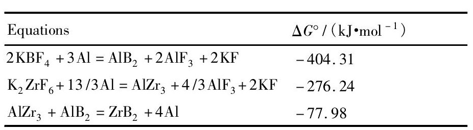 850 ℃ 左右, K2Zr F6和KBF4在铝熔体中会发生下列反应, 如表2 所示。由表2 中数据可看到, 表中各个化学反应吉布斯自由能 ΔG° 都为负值[14], 说明在热力学上这些反应都能够发生。从表中还可以看出, 当B /Zr摩尔比为2 时, 反应产物为Zr B2, 但是在图1 ( c) 中发现还存在微量的块状Zr Al3相, 其原因可能是KBF4密度更小, 反应过程中KBF4粉末更容易随反应产物上浮到溶液表面, 使KBF4粉末损耗量较大, 而多余的K2Zr F4则与Al反应生成了Zr Al3。