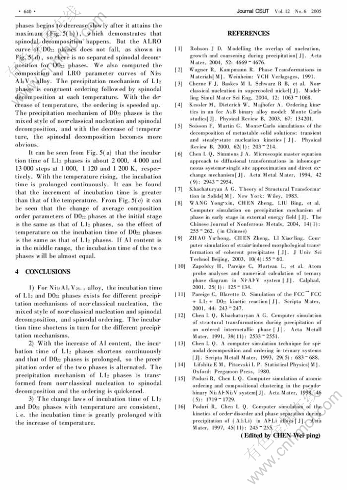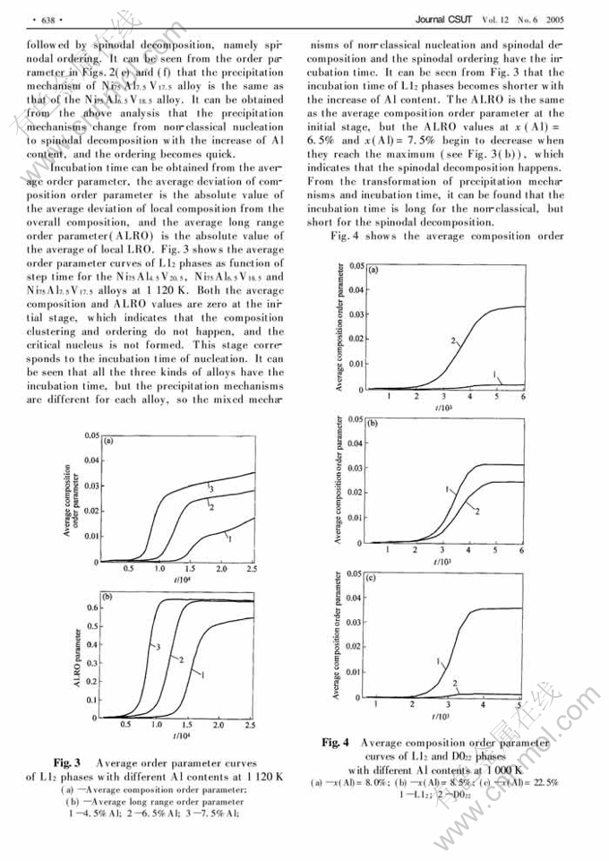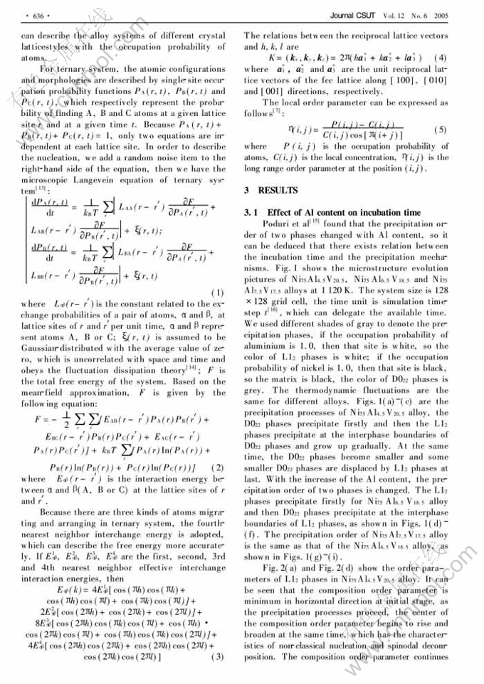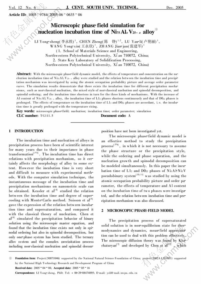 Abstract: With the microscopic phase-field dynamic model, the effects of temperature and concentration on the nucleation incubation time of Ni75AlxV25-x alloy were studied and the relation between the incubation time and precipitation mechanism was investigated by using the atomic occupation probability picture and average order parameter curve. The simulation results demonstrate that there exists the incubation time for different precipitation mechanisms, such as non-classical nucleation, the mixed style of non-classical nucleation and spinodal decomposition, and spinodal ordering; and the incubation time shortens in turn for the three kinds of mechanisms. With the increase of Al content of Ni75AlxV25-x alloy, the incubation time of L12 phases shortens continuously and that of D022 phases is prolonged. The effects of temperature on the incubation time of L12and D022 phases are accordant, i.e. the incubation time is greatly prolonged with the temperature rising.