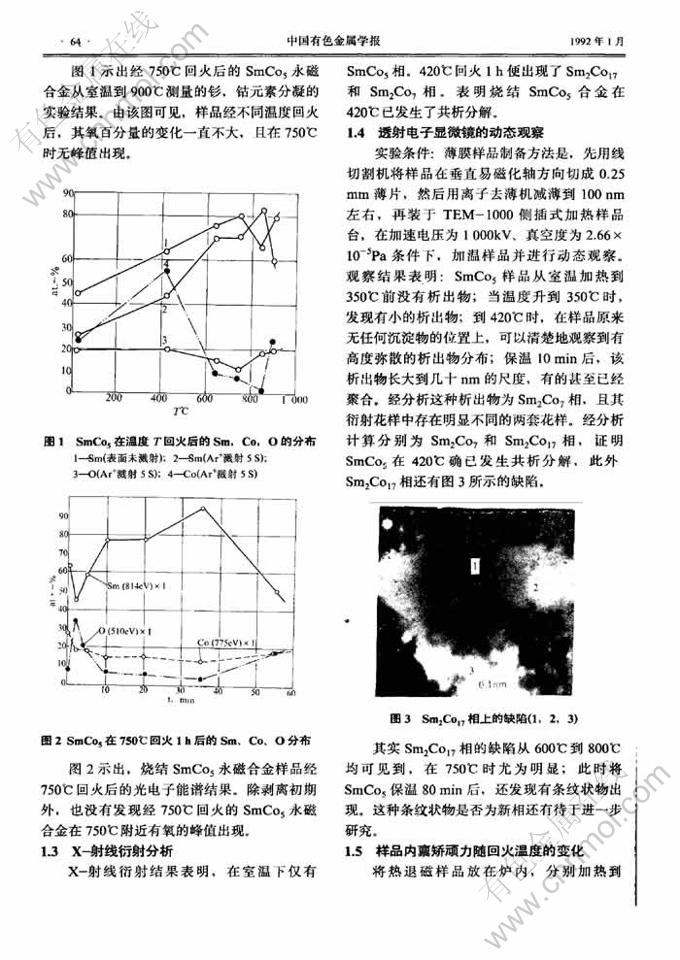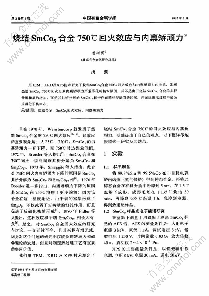 摘 要:用 TEM、XRD 及 XPS 技术研究了烧结 SmCO5合金750℃回火效应与内禀矫顽力的关系。发现烧结 SmCo5 750℃回火后其内禀矫顽力严重降低的根本原因,并不是由于烧结 SmCo5合金的共析分解和氧的增加,而是其共析分解的 SmCo17相中存在某些多缺陷的区域,并在反磁化过程中成为反磁化形核中心。