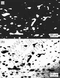 分别用峰值法和背底固定法测量20×物镜摄取的金相图像(图4)的孔隙率如图5所示。从图5可以看出,图像二值分割后,测量的孔隙与原图像孔隙(图4)非常吻合,孔隙率测量结果均为3.9%。用峰值法和背底固定法测量100×物镜摄取的金相图像(图6)的孔隙率如图7所示。采用峰值法二值分割后,待测量孔隙(图7(a))与原图像(图6)孔隙吻合较好,孔隙率测量结果为6.3%;用背底固定法测量时,由于受高倍物镜本身性能及显微镜灯光等因素的影响,背底灰度很不均匀,导致二值分割后待测量孔隙直径(图7(b))与原图像(图6)孔隙直径不太吻合,孔隙率测量结果为21.8%,明显大于实际的孔隙率。这表明,对高倍物镜(100×,50×)摄取的金相图像采用峰值法测量其孔隙率与孔隙直径分布优于用背底固定法。对低倍物镜(20×,10×,5×)摄取的金相图像采用峰值法与图像背底固定法测量其孔隙率与孔隙直径分布都能得到较好的测量结果,但由于图像背底固定法能调节相同的背底灰度参数,选取固定的二值分割值,保证测量结果的重复性,且测量简单、快速。因此,低倍物镜摄取的金相图像采用图像背底固定法测量其孔隙率与孔隙直径分布优于用峰值法所得结果。