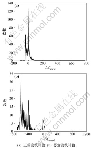 将ΔCcwnd作为检测因子,在图2的拓扑中进行实验分析。设置瓶颈带宽10 Mb/s,端到端单向延迟20 ms,4条XCP流中1条是恶意流。图4分别显示了正常流与恶意流ΔCcwnd的统计结果。从图4可以看出:正常流窗口变化值基本服从正态分布,变化的期望值趋近于0,验证了之前的分析结果;而恶意流窗口变化值基本都为较大的负值,且偏离正常值很远;因此,可以通过实验统计得出正常流的分布规律并计算正常数据流的接受区间,若ΔCcwnd落在接受区间以外,则判断为恶意流并丢弃其所传输的数据包,作为惩罚。