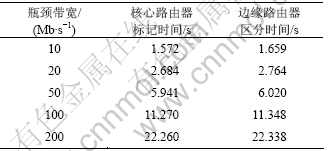 3.1节中的实验设置相仿,2条正常XCP流和1条恶意流从0 s启动,瓶颈带宽变化时往返延时固定为40 ms,网络延时变化时瓶颈带宽固定为20 Mb/s。表3显示了随着瓶颈带宽增加,恶意特征出现延迟使得核心路由器检测机制标记和边缘路由器区分判断时间相应推迟。表4反映了边缘路由器区分时间随延时增大逐渐增加,核心路由器标记时间随延时变化只是略增加;而在延时升高到100 ms时,源端响应路由器的反馈有较大滞后性,导致队列很快达到较高的值,核心路由器检测时间有所缩短。
