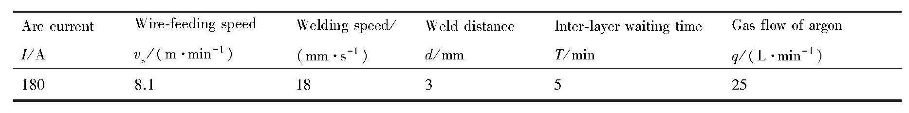 试验采用的增材制造系统主要由CMT焊机及KUKA机器人组成。焊机为CMT 4000 Advance型弧焊电源,可提供CMT、CMT+脉冲、CMT+交流、CMT+脉冲+交流和常规直流MIG(melt inert-gas welding) 5种焊接电源模式。试验采用CMT+交流模式成形沉积试样。试验初期进行了单道单层、多道单层等大量基础工艺试验,对比分析了不同工艺参数下单道单层焊道的成形形貌(熔高、熔宽等)以及多道单层成形试验的表面平整度、尺寸精度,得出成形多道多层块状试样的最初工艺参数,同时在进行多道多层工艺试验时逐步调整并优化工艺参数,从而得出成形块状试样的最优成形参数,如表2所示。在实际成形过程中,为了避免成形试样出现坍塌现象,在基板底部采用水循环冷却装置,加快试样的冷却速度,减少热累积,并在成形过程中逐步调整成形参数,控制热输入,保证焊机电流的稳定性。