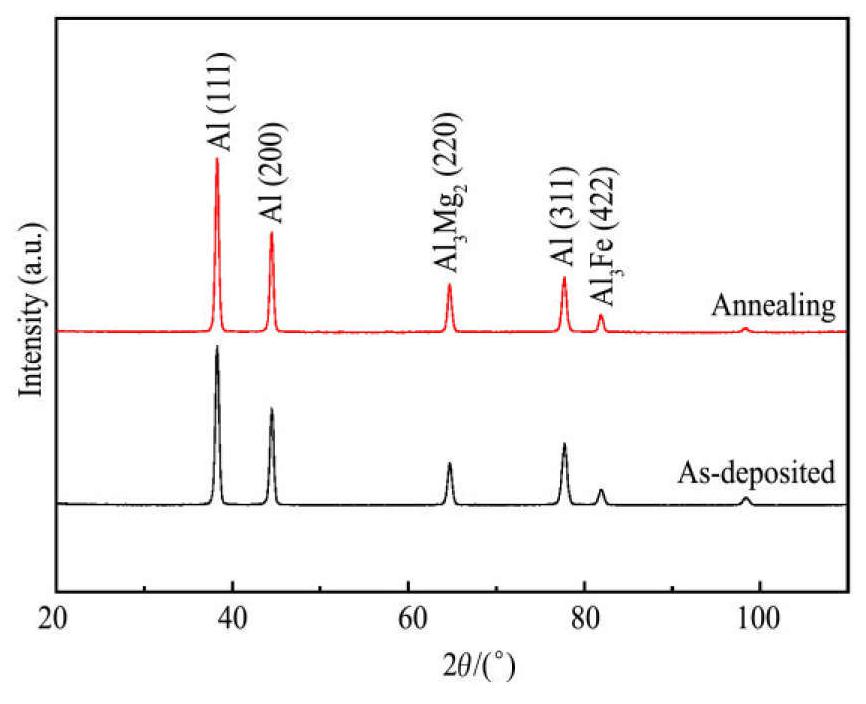 图2为WAAM 5356铝合金试样的X射线衍射(XRD)图谱。从沉积态和退火态样品的谱线中看出,电弧成形5356铝合金试样中以α(Al)相为主,同时存在少量的β(Al3 Mg2 )相,又由于合金存在一定量Fe元素,衍射谱中也出现了较弱的Al3 Fe相衍射峰。对比退火前后发现,强峰出现位置相同,说明退火前后试样内部相的组成基本相同,但经退火后谱线中β(Al3 Mg2 )相所对应峰的强度高于退火之前,这表明经退火后试样内部析出更多的β(Al3 Mg2 )相。
