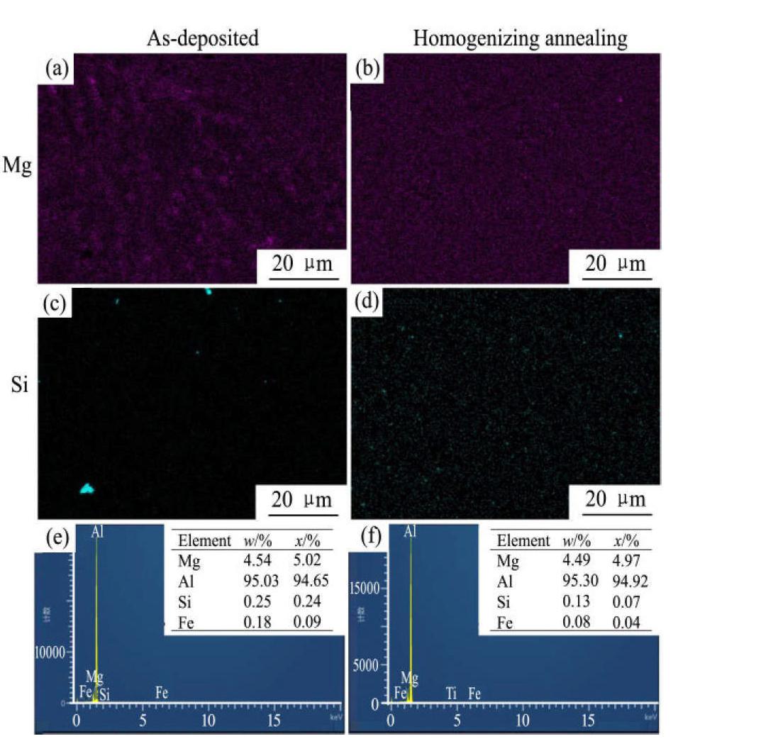 图5为采用能谱(EDS)分析出的均匀化热处理前后试样中合金元素分布状况,可以看出未经均匀化热处理的沉积试样中元素产生明显偏析,其中Mg,Si元素出现富集现象,如图5 (a,c)所示。而将试样进行420℃/18 h均匀化热处理,在退火温度下,组织内β相及Al3 Fe等相重新固溶到α(Al)基体中,经较长时间保温后,合金内各组成元素成分扩散,在空冷过程中逐渐析出,组织内非平衡共晶相成分扩散,趋于均匀化,未出现较为明显的偏析现象,如图5(b,d)所示。