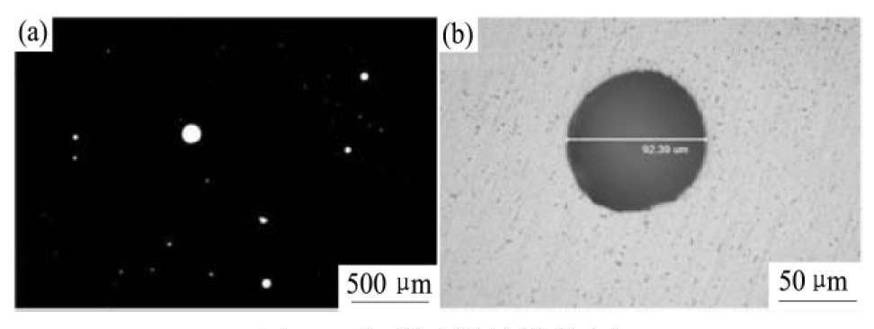 图6(a)为采用超声无损检测技术检测到的孔缺陷,可以看出成形试样中分布有大小尺寸不等的气孔缺陷,图6(b)为光学显微镜拍摄到的较大气孔,其直径约为90μm,采用阿基米德方法测定该成形试样孔隙率约为0.38%,优于大多数焊接样品
